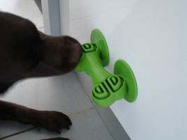 Utiliser un jouet éducatif comme un kong à remplir de petites friandises ou de croquettes. La difficulté d’accès aux gourmandises (qui peuvent être bien coincées dans le jouet) va occuper le chien mentalement. Attention, une restriction : vérifier que la taille du jouet est assez grande pour le chien et avoir préalablement joué avec le chien à plusieurs reprises, afin d’être sûr que le chien ne va pas passer son temps à le déchiqueter. Pour ce faire certains modèles dits « extrêmes » sont vraiment très résistants à tous les machouillages.